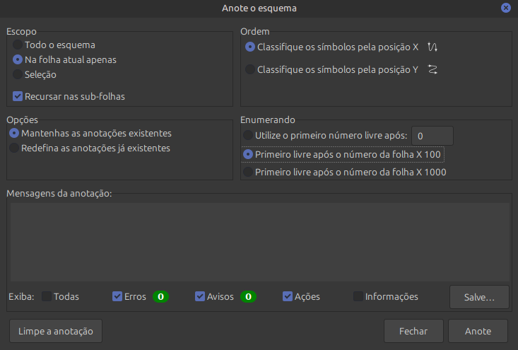 O KiCad nos permite configurar até duas opções de enumeração com multiplicação (além da padrão, que é sequencial): um offset de 100 × o número da folha, ou 1000 × o número da folha. Para utilizar, basta selecionar a opção no KiCad e clicar em Anotar.